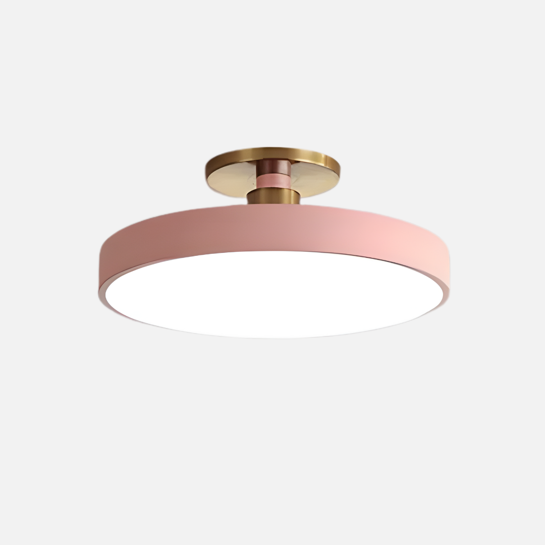 This ceiling-mounted light features a slim, flat disc profile designed to sit close to the ceiling surface. The integrated LED source provides even, downward-facing light suitable for general indoor lightning. Its low-profile construction allows installation in rooms with standard or lower ceiling heights.
