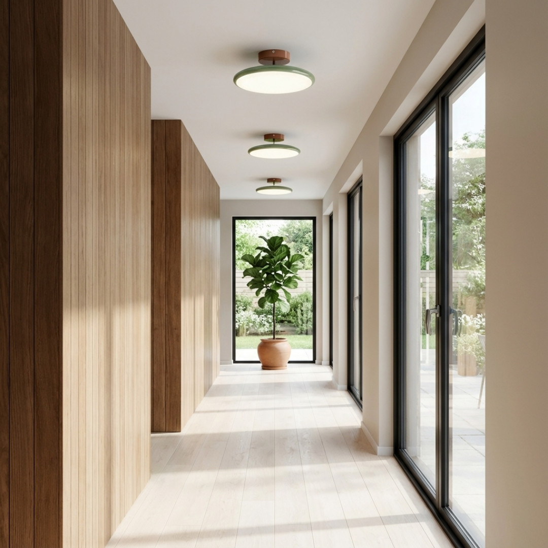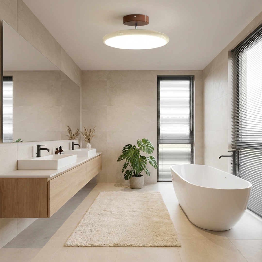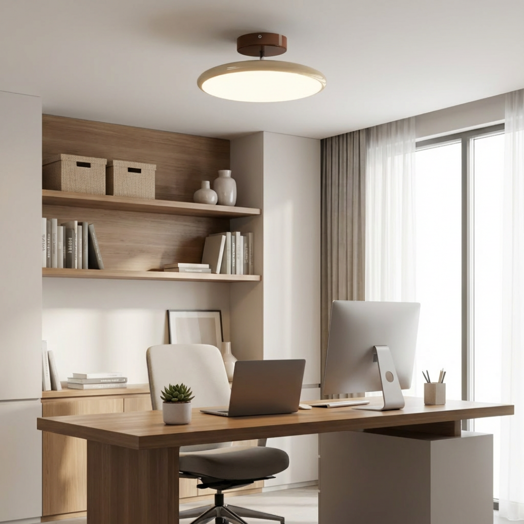 Slim disc profile: Thin circular form creates a clean, unobtrusive ceiling presence.