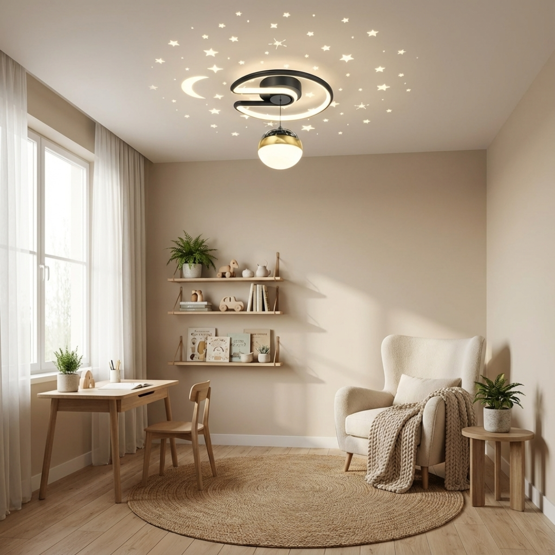 This ceiling-mounted light features a compact central body designed to project star and moon patterns across the surrounding ceiling surface. The integrated LED source produces a decorative sky-like effect while providing functional overhead lighting. Its size and surface-mounted format make it suitable for a variety of indoor interior spaces.