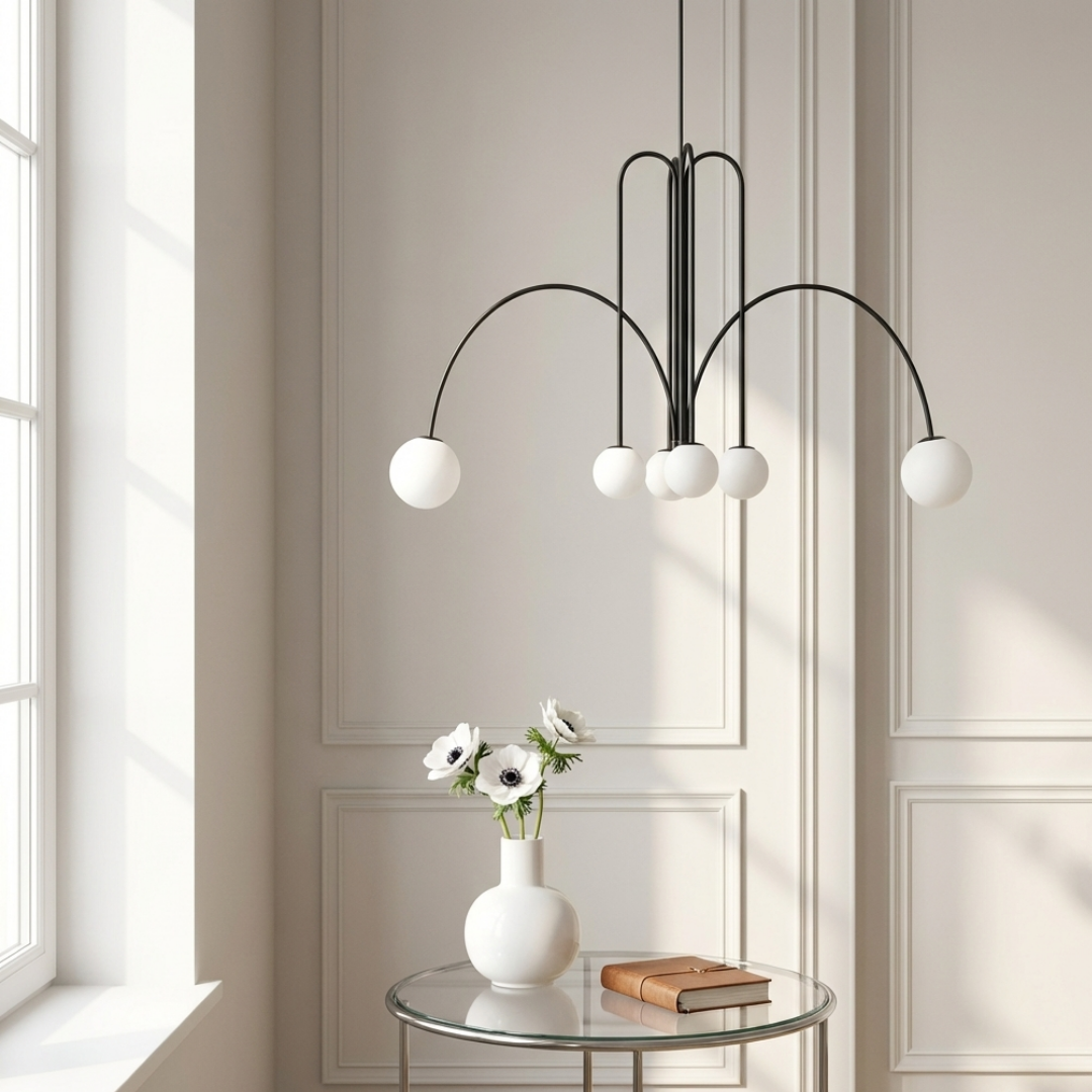 Arched arm structure: Curved arms form a symmetrical layout with evenly spaced light points.