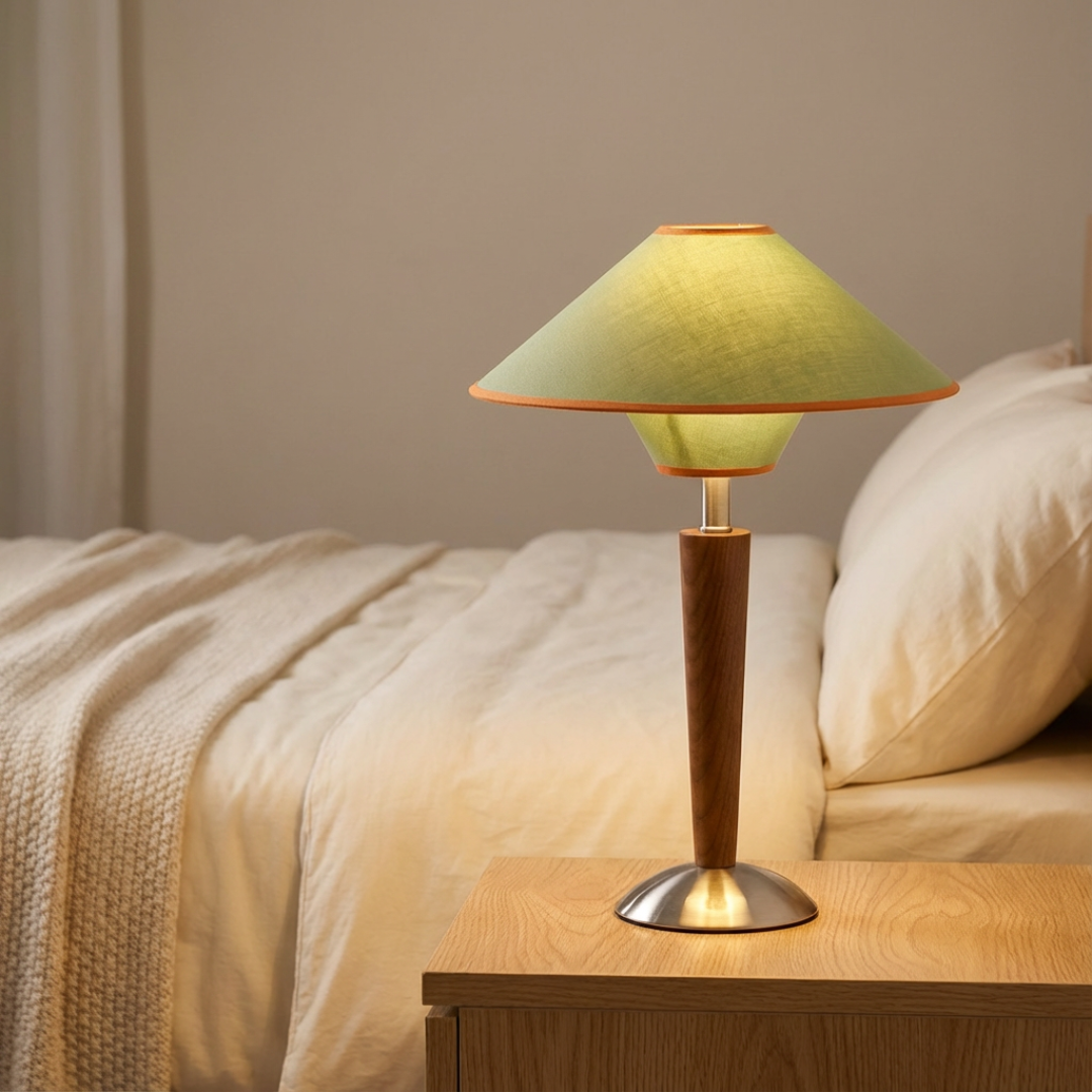 This table lamp features a wide tapered shade paired with a straight vertical column, creating a balanced silhouette with a round, stable base. Its proportions make it suitable for desks, side tables, bedside areas, and shelves in a variety of indoor spaces.